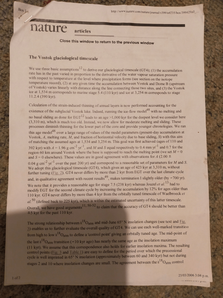 In the paper my friend referred to various research, including a paper published in the premier science journal, Nature, which described an analysis of a deep ice core from Antarctica: the Vostok ice core. The purpose of this analysis (as I recall) was to determine concentrations of past, atmospheric gases along the length of the ice core, representing increasing depths of ice from the location where it originated, and due to the incremental accumulation of ice at that location over a long period, and the concurrent exposure of its surface to the atmosphere, the concentrations of gases at times in the past.