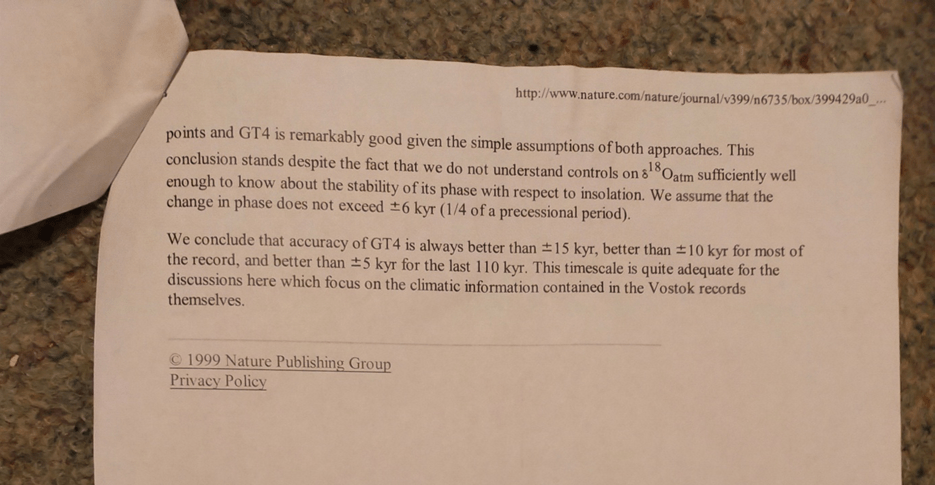It was not clear to me if, or how, the scientists had counted the ice layers. And as the whole findings of the paper concerned physical states at certain times in the past, and this supposedly was the method by which this had been determined, for this reason also it seemed poor form. However, by following footnotes and links from links, I eventually found a record of the method. I have appended a picture of it to this article, because it became a milestone in my journey of faith.